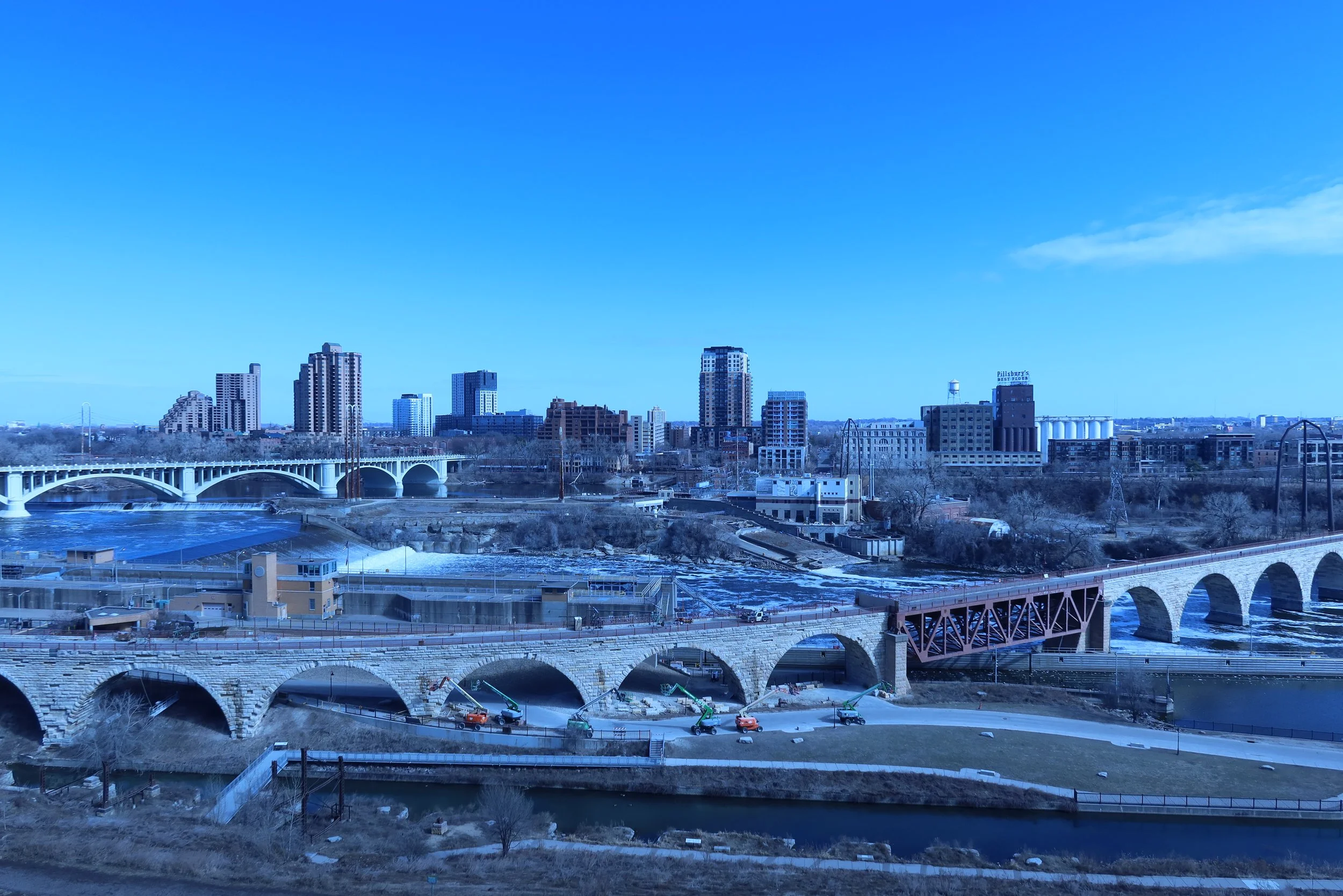 The iconic Stone Arch Bridge as seen from the observation deck of the Mill City Museum.